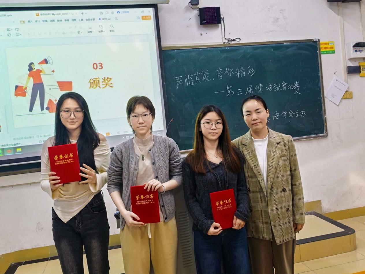 本次德语配音比赛进一步坚定了德语系学子学习德语的信心与热情。同时,这场精彩的赛事对在场观赛者而言亦是一次难得的学习契机,大家得以直观领略德语语音语调的灵动表达,感受角色塑造与情感传递的语言艺术。展望未来,德语系将会继续秉持“以赛促练”的理念,通过举办多元化的语言文化交流赛事,持续为学生搭建语言实践与风采展示的平台。