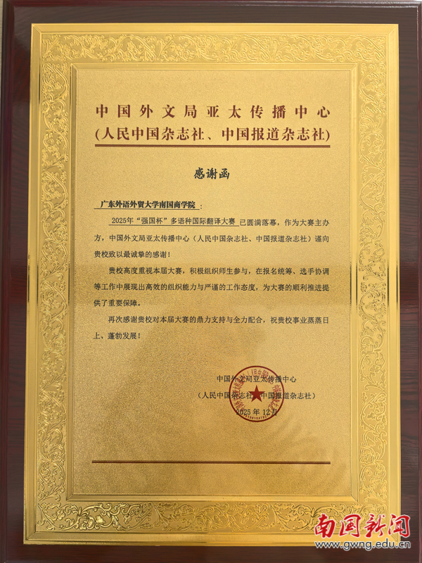 本网讯 在近日落幕的2025年“强国杯”多语种国际翻译大赛中,我校学子共荣获31个奖项,创下校外赛事单次获奖新高。同时,学校因组织工作出色获主办方——中国外文局亚太传播中心(人民中国杂志社、中国报道杂志社)发函致谢,实现竞赛成绩与组织口碑“双丰收”。