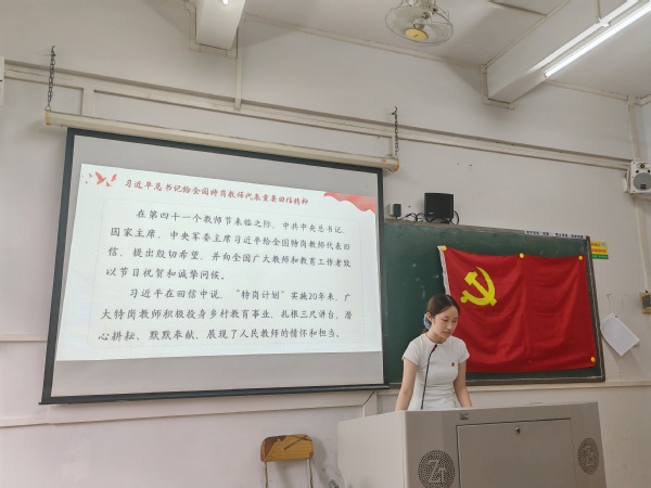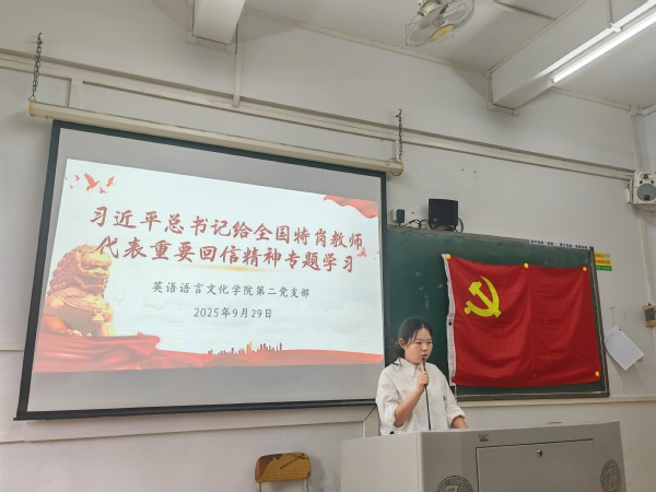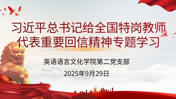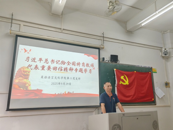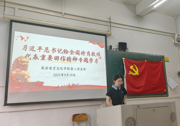 为深入学习贯彻习近平总书记关于建设教育强国的重要论述,大力弘扬教育家精神,切实将立德树人根本任务落到实处,英文学院第二党支部于9月29日在D202教室开展习近平总书记给全国特岗教师代表回信精神专题学习会,全体支部同志参会并深入交流学习心得。