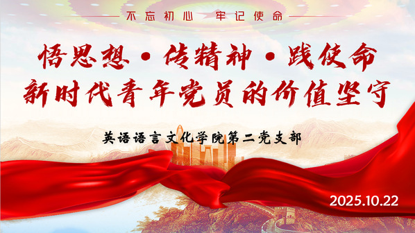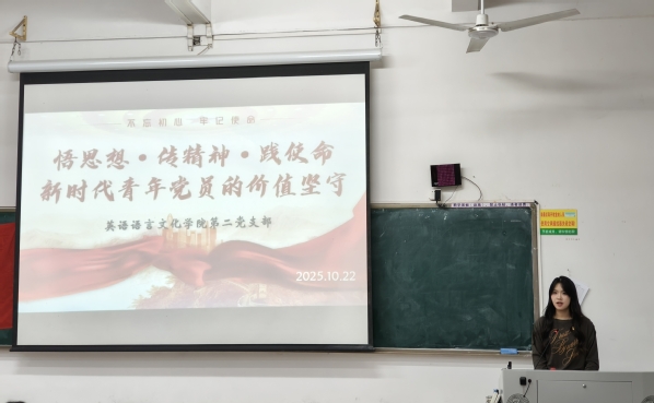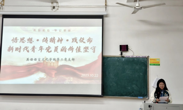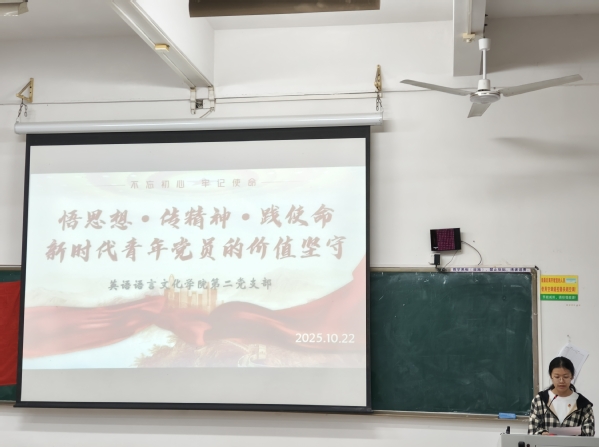 为深入学习贯彻习近平新时代中国特色社会主义思想,引导青年党员坚定理想信念、传承红色基因、勇担时代使命,英文学院第二党支部于10月22日在G103教室举办“悟思想·传精神·践使命——新时代青年党员的价值坚守”主题党日活动。支部全体党员参加,并围绕主题展开深入交流与研讨。