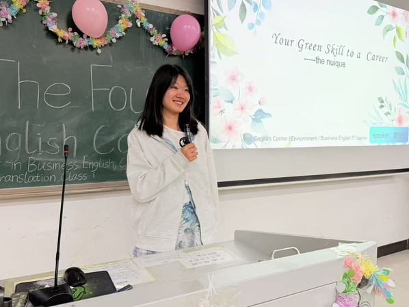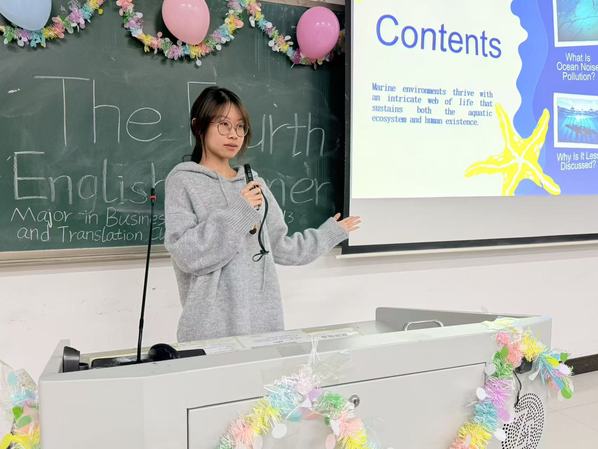 在演讲过程中,四位演讲者梁宇桐、石振鑫、黄加敏和何芷珊紧扣本期英语角主题,聚焦海洋威胁与保护、绿色技能在商务中的应用、环境问题与人类应对优势,以及海洋噪音污染的相关情况与解决建议。
