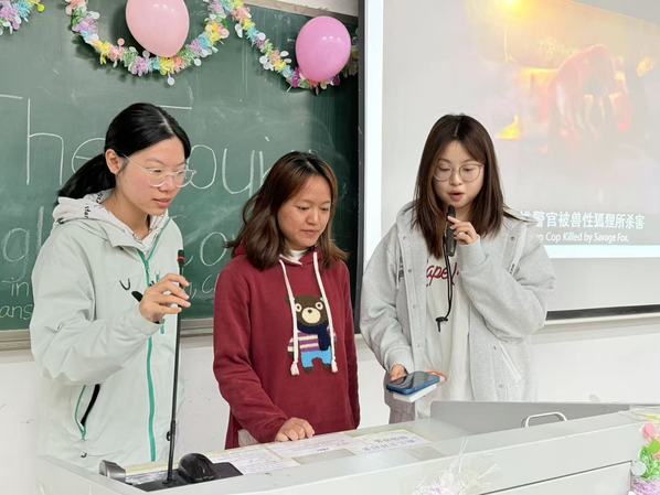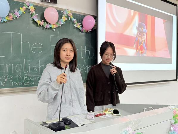 配音环节中,来自25级商务英语3班的李碧婷、陈奎朱和彭琳同学,她们给大家带来了动画电影《疯狂动物城》的片段配音。该片段既揭露了野心家借偏见搅局夺权的险恶,也彰显了正义者凭默契与智谋破局求真的坚定果敢。来自25级翻译1班的苏紫珊和梁慧思同学,也为大家献上了动画电影《疯狂动物城》超燃片段的精彩配音!片段亮点十足,既生动呈现了种族偏见引发的服务小摩擦,还奉上了超解气的公正解决名场面,也传递出反歧视、守原则与促平等包容的积极力量。