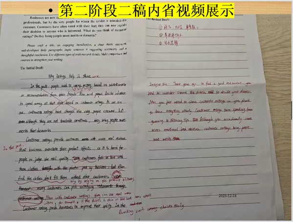 获奖亮点:作品亮点:初稿内省视频详实,不足分析客观;二稿内容经互评后明显充实。视频关键修改突出,表达认真;AI反馈选取典型,分析到位。