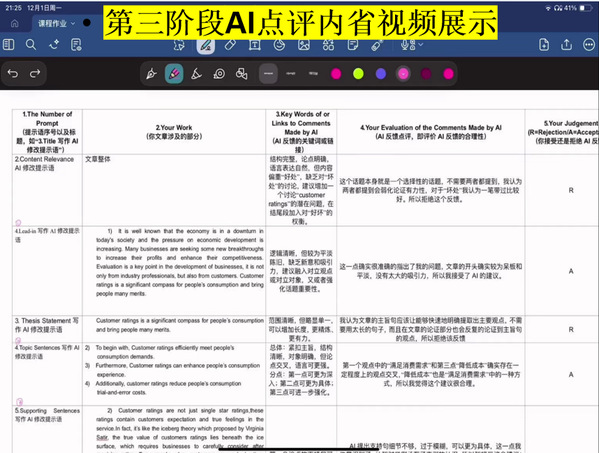 AI反馈点评阶段聚焦“批判性思维培养”。教师提供结构话提示语,引导AI对文章各部分进行写作技巧点评;同学们需从中筛选5项最具价值的反馈,分析其合理性并作出“接受(A)”或“拒绝(R)”的判断,最终通过视频阐述“反馈选取理由”与“个人最大提升点”。不少同学展现出较强的思辨能力——有的指出AI建议与主题的适配问题,有的结合课堂知识对AI提出质疑,真正体现了“以我为主、理性运用AI”。