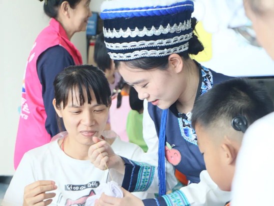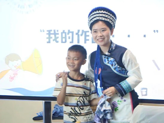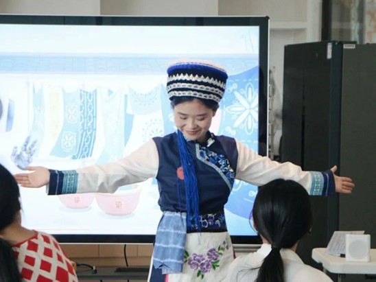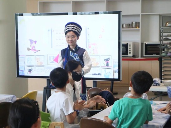 活动伊始,主讲教师陈宝怡同学身着白族服饰惊艳亮相,瞬间吸引了孩子们的目光。当孩子们好奇于老师的独特服饰时,陈宝怡以生动形象的语言,引领孩子们走进云南大理白族人的神话故事世界。在她的讲述下,孩子们仿若置身大理的苍山洱海间,感受白族人民的智慧与情感,领略民族文化之美。孩子们在她的带领下,学习了用白族话进行简单交流,一句句稚嫩的“脑秋”(你好)回荡在活动现场,传递着孩子们对白族文化的喜爱与尊重。