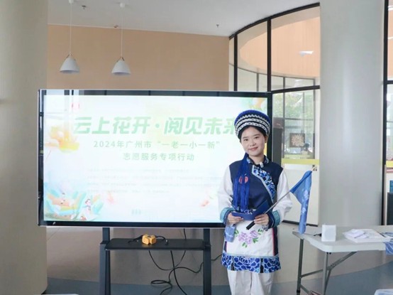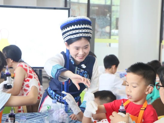 活动于广州市儿童活动中心拉开帷幕,现场精心布置了扎染元素,营造出浓厚的民族氛围。主讲教师陈宝怡身着白族传统服饰,服饰上蓝白相间的扎染花纹,为活动增添了一抹亮丽的色彩。